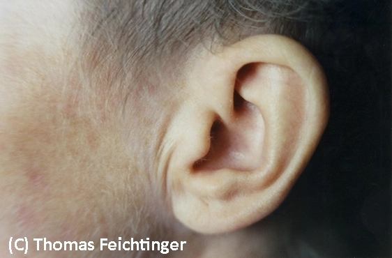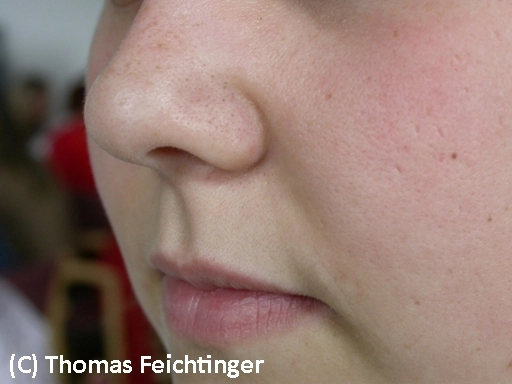 Zeichen im Gesicht: Die zuständige Farbe ist „wächsern“, ein gelblich gebrochenes Weiß, wie eine Altarkerze. Diese Färbung der Haut sieht man vor allem an der Nasenunterkante bis zur Nasenspitze hinauf (siehe Abbildung), als hell unterlegte Augenbrauen und als wächserne Ohren (siehe Abbildung).
